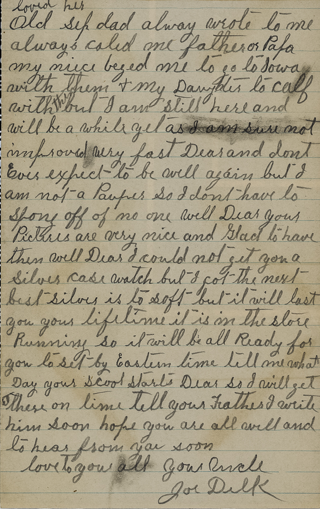 Well Dear your Pictures are very nice and Glad to have them well Dear I could not get you a Silver case watch but I got the next best silver is to soft but it will last you your life time it is in the store Running so it will be all ready for you to set by Eastern time tell me what day your scool starts Dear so I will get there on time tell your Father I write him soon hope you are all well and to hear from you soon
