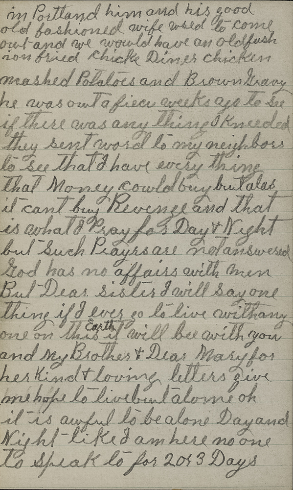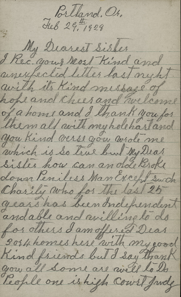 I Rec. your most kind and unexpected letter last nighht withits kind message of hope and cheer and welcome of a home and I thank you for them all with my hole hart and you kind verse you wrote me which is so true but my Dear sister how can an olde Broke down Peniless Man Except such charity who for the last 25 has been Independent and able and willing to do for others I am offered Dear 3 or 4 homes here with my good kind friends but I say thank you all some are well to Do People one is high court Judge in Portland him and his good old fashioned wife used to come out and we would have an old fashion fried chicke Diner chicken mashed Potatoes and Brown Gravey he was out a fiew weeks ago to see if there was any thing I Kneeded they sent word to my neighbors to see that I have every thing that money could but but alas it cant buy Revenge and that is what I Pray for Day & Night but such Prayrs are not answered God has no affairs with men