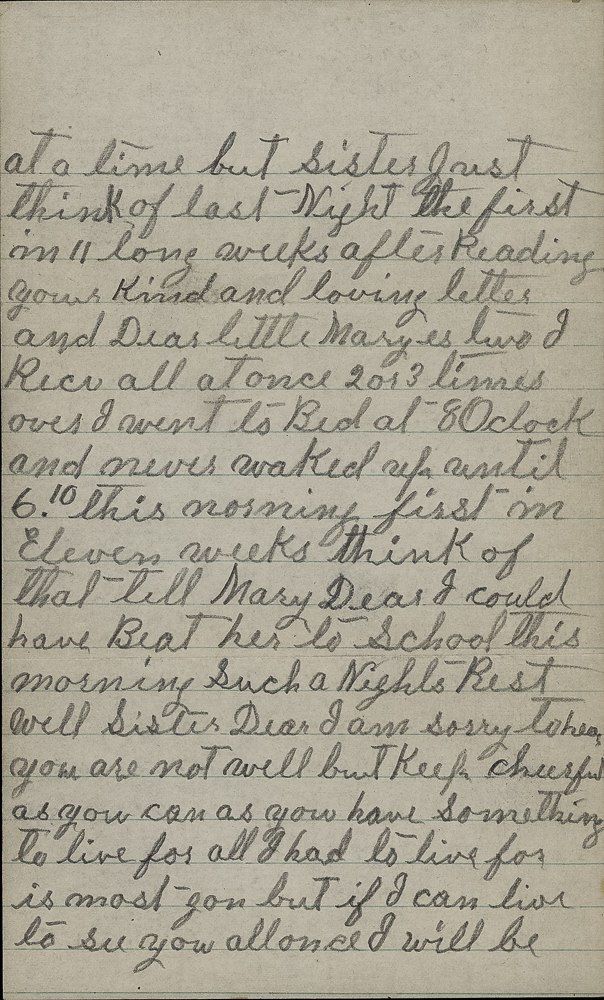 But Dear sister I will say one thing if I ever go to live with any one on this Earth it will bee with you and my Brother & Dear Mary for her kind & loving letters give me hope to live but alone oh it is awful to be alone Day and Night like I am here no one to speak to for 2 or 3 Days at a time but Sister Just think of last Night the first in 11 long weeks after Reading your kind and loving letter and Dear little Maryes two I Reci all at onece 2 or 3 times over I went to Bed at 8 Oclock and never waked up until 6.10 this morning first in Eleven weeks think of that tell Mary Dear I could have Beat her to School this morning Such a Nights Rest.