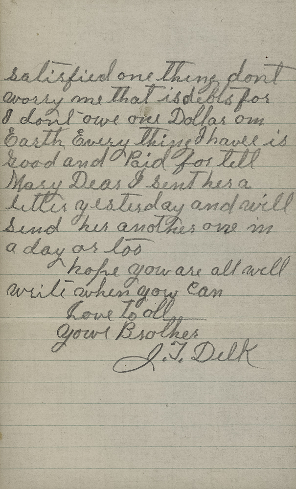 Well Sister Dear I am sorry to hear you are not well but Keep cheerful as you can as you have something to live for all I had to live for is most gon but if I can live to see you all once I will be satisfied one thing dont worry me that is debts for I dont owe one Dollar on Earth Every thing I have is good and Paid for tell Mary Dear I sent her a letter yesterday and will send her another one in a day or too