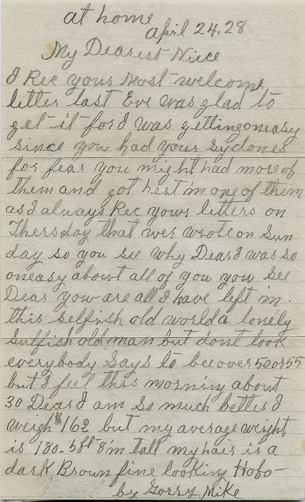 I rec your most welcome letter last eve was glad to get it for I was getting uneasy since you had your sydones for fear you might had more of them and got hert in one of them as I always rec your letters on Thersday that wer wrote on Sunday so you see why Dear I was so oneasy about all of you. You see Dear you are all I have left in this selfish old world a lonely sulfish old man but don’t look everybody says to be over 50 or 55 but I feel this morning about 30. Dear I am so much better I weigh 162 but my average weight is 180. 5 ft 8 in tall my hair is a dark Brown fine looking Hobo – by Sorry Mike.