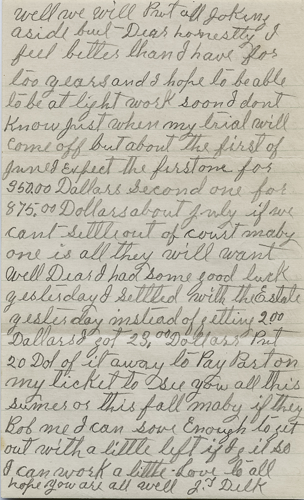 Well Dear I had some good luck yesterday I settled with the estate yesterday instead of getting 2.00 Dollars I got 23.00 Dollars. Put 20 Dol of it away to pay part on my ticket to see you all this sumer or this fall maby if they Bof me I can save enough to get out with a little left if I git so I can work a little.