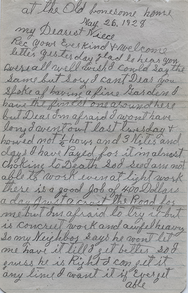 Rec your Ever kind & welcome letter yesterday glad to hear you were all well wish I could say the same but I cant Dear you spoke of having a fine Garden I have the finest one around here but Dear Im afraid I wont have long I went out last tuesday & howed not 1/2 hour and 3 nites and days I have Payed for it in almost choking to Death so I see I am not able to work even at light work there is a good Job of 4.00 Dollars a day Just a crost the Road for me but Im afraid to try it but is concreet work and awfel heavy So my Neighbor says he wont let me have it till I get better so I guess he is Right I can get it any time I want it if ever get able