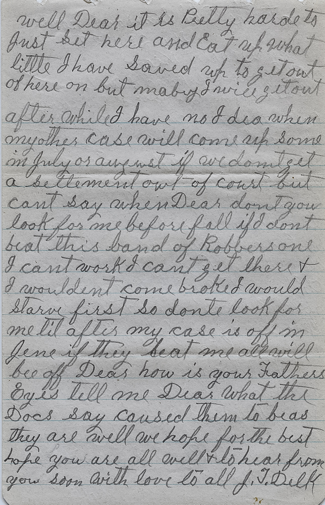 Well Dear it is Pretty harde to just sit here and Eat up what little I have saved up toget out of here on but maby I will get out after while I have no idea when my other case will come up some in July or august if we dont get a setlement out of court but cant say when Dear dont you look for me before fall if I dont beat this band of Robbers one I cant work I cant get there & I wouldent come broke I would starve first so donte look for me til a fter my case is off in June if they beat me all will bee off Dear how is your Fathers Eyes tell me Dear what the Docs say caused them to be as they are well we hope for the best hope you are all well & to hear from you soon with love to all J. T. Delk
