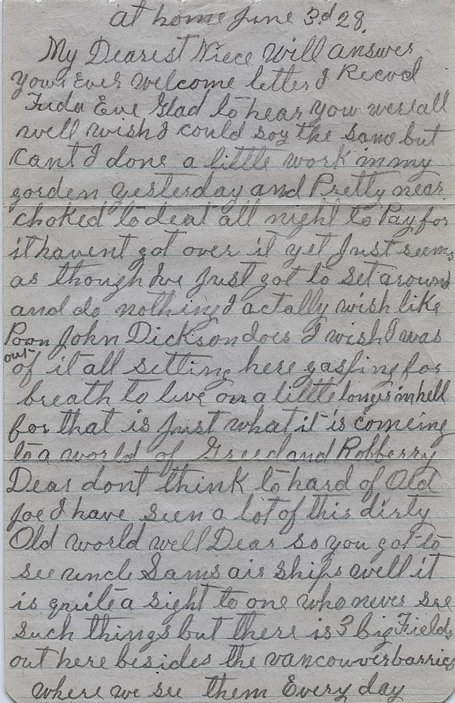 My Dearest Niece Will answer your ever welcome letter I recvd Friday Eve Glad to hear you were all well wishe I could say the same but cant I done a little work in my garden yesterday and Pretty near choked to deat all night to Pay for it havent got over it yet Just semms as though Ive just got to sit around and do nothing I actally wish lik Poor John Dickson does I wish I was out of it all sitting here gasping for breath to live on a little longer in hell for that is just what it is coming to a world of Greed and Robberry