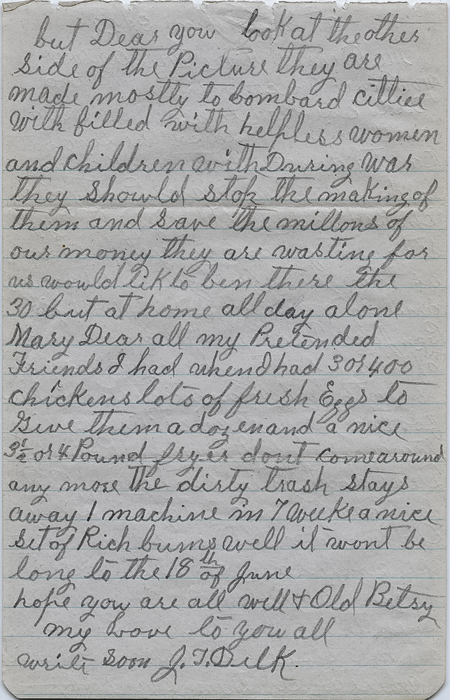 Dear ont think to hard of Old Joe I have seen a lot of this dirty Old world well Dear so you got to see uncle Sams air ships well it is quite a sight to one who never see such things but there is 3 big Fields out here besides the vancouver barrics where we see them Every day but Dear you look at the other side of the Picture they are made mostly to bombard citties with filled with helpless women and children with during war they should stop the making of them and save the millons of our money they are wasting for us would lik to ben there the 30 but at home all day alone