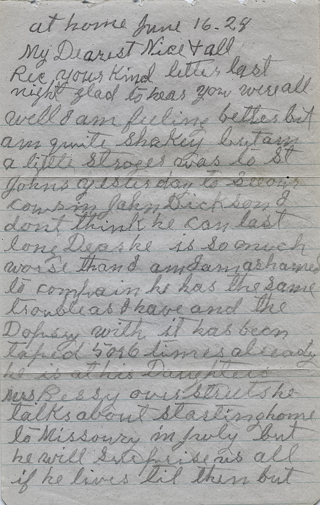 My Dearest Niece & all Rec your Kind letter last night glad to hear you were all well I am feeling better but am quite shakey but am a little stroger was to St Johns yesterday to see our cousin John Dickson I dont think he can last long Dear he is much worse than I am I am ashamed to complain he has the same trouble as I have and the Dopsy with it has been taped 5 or 6 times already he is at his Daughters Mrs Ressy Overstreets he talks about starting home to Missoury in July but he will surprise us all if he lives til then but is like the Docks Say I am hard to Kil but we will both get there Pretty Soon