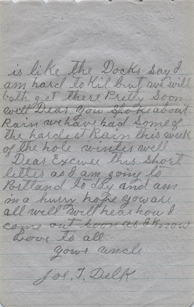 Well Dear you spoke about Rain we have had Some of the hardest Rain this week of the hole winter well Dear Excuse this short letter as I am going to Portland today and am in a hurry hope you are all well will hear how I come out soon as I know