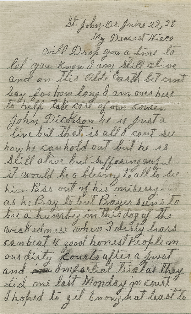 will Drop you a line to let you know I am still alive and on this olde Earth but cant say for how long I am over here to help take care of our cousin John Dickson he is just a live but that is all I cant see how he can hold out but he is still alive but suffering awful it would be a blesing to all to see him Pass out of his missery as he Pray to but Prayer seems to bee a humbeg in this day of the wickedness when 3 dirty liars can beat 4 good honest people in our dirty courts after a just and impartial trial as they did me last Monday in court. I hoped to get Enough at least to come to see you all so I put every Dollar I had in it and lost it by a dirty Forged Piece of Paper they had made up and swore to but I havent done with them yet