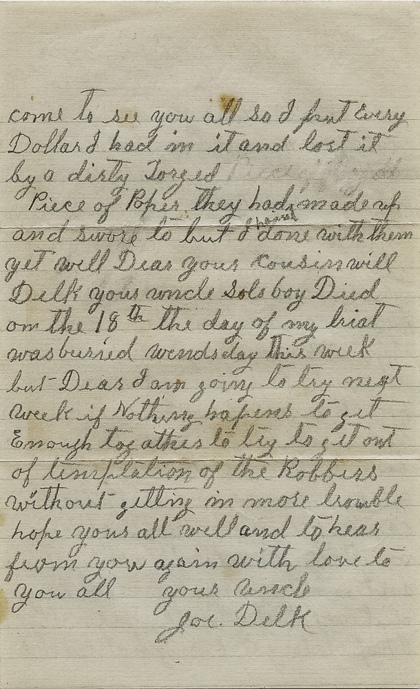 Well Dear your cousin Will Delk your uncle Sols boy Died on the 18th the day of my trial was buried wendsday this week but Dear I am going to try next week if Nothing hapens to get Enough together to try to get out of temptation of the Robbers without getting in more trouble hope your all well and to hear from you again with love to you all your uncle