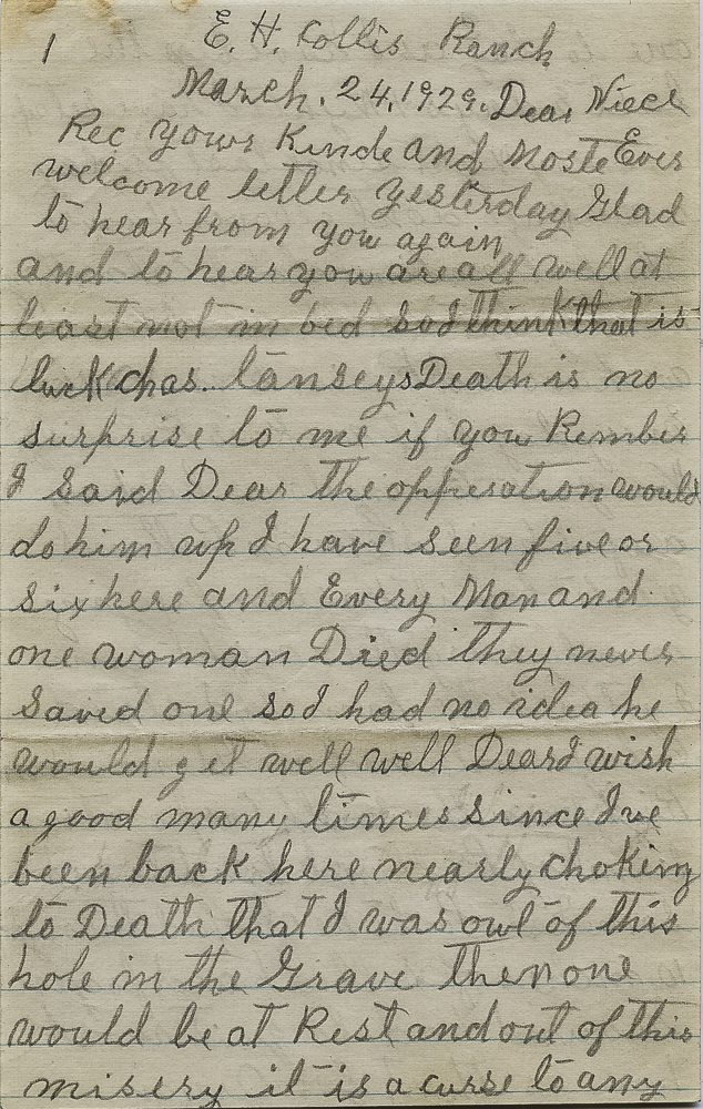 Rec your kinde and moste Ever welcome letter yesterday glad ato hear from you again and to hear you are all well at least not in bed sad think that is luck chas. Tanseys Death is no surprise to me if you Rember I said Dear the opperation would do him up I have seen five or six here and Every man and one woman Died. They never saved on so I had no idea he would get well. Well Dear I wish a good many times since I've been back here nearly choking to Death that I was out of this hole in the Grave. Then one would be at Rest and out of this misery it is a curse to any one to lay as I have ben the last 8 days & nights. I have set up every night since last friday a week ago. don't get over 1 hours sleep at no time dont Eat nothing hardly but a little mush & milk.