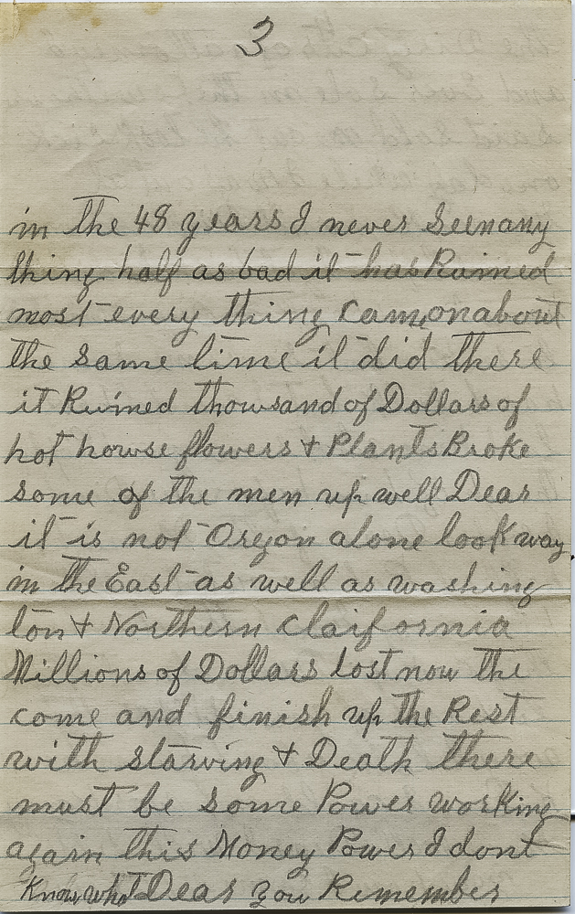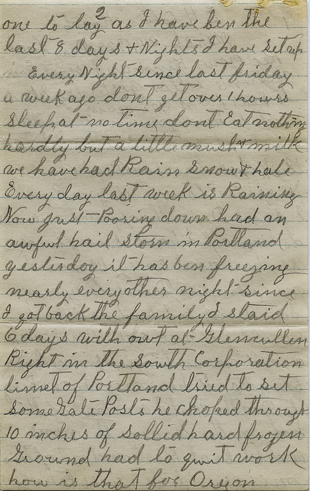 We have had Rain Snow & hale Every day last week is Raining Now just Pooring down hard an awful hail storm in Portland yesterday it has ben freezing nearly every other night since I got back the family I staid 6 days with out at Glencullen Right in the South Corporation limet of Portland tried to set some Gale Posts he choped through 10 inches of sollid hard frozen ground had to quit work how is that for Oregon.In the 48 years I never see many thing half as bad it has rained most every thing came on about the same time it did there it ruined thousands of dollars of hot house flowers & plants. Broke some of the men up.
