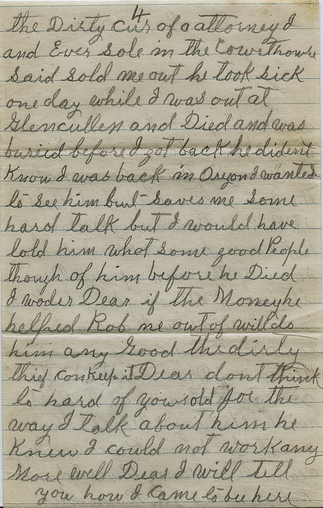 Dear you remember the dirty cur of a attorney I and ever sole sole in the court house said sold me out he took sick one day while I was out at Glencullen and Died and was buried before I got back he didnt know I was back in Oregon I wanted to see him but saves me some hard talk but I would have told him what some good people though of him before he Died. I woder Dear if the Money he helped Rob me out of will do him any good the dirty thief can keep it. Dear dont think to hard of your old Joe the way I talk about him he knew I could not work any more.