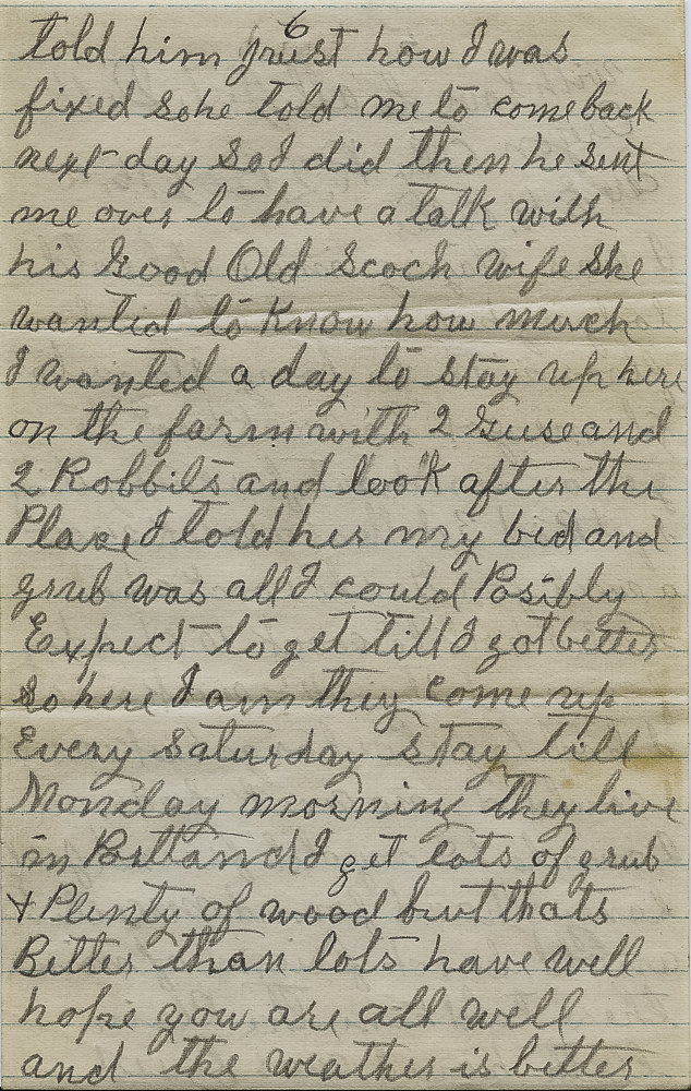 Well Dear I will tell you how I came to be here. I was staying in an old cold lodging house on the third floor with to long stairs to clime got so weak had to get or send out for every thing I got Paid 3 dollars a week 25cts a week for Gas to coock what little I had to coock 10cts a day for wood staid 4 1/2 weeks so I had to get out or go broke as I could do no work so I went Down to see my old friend Judge langgeth and found Mr. Collis an old Scoch friend of mine there told him the plain truth how I was fixed told him just how I was fixed so he told me to come back next day so I did then he sent me over to have a talk with good old Scoch wife she wanted to know how much I wanted a day to stay up here on the farm with 2 Geese and 2 rabbits and look after the Place. I told her my bed and grub was all I could posibly expect to get till I got better. So here I am they come up every Saturday stay till Monday morning they live in Portland I get lots of grub & plenty of wood but thats Better than lots have well hope you are all well and the weather is better.