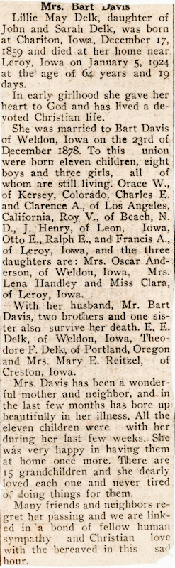 Children: Orace Wesley (1880-) Charles Emery (1882-1941) Clarence Arthur (1884-1935) Roy Vincent (1887-1936) Lina (1888-1966) Otto Earling (1890-) Lena (1892-) Joseph Henry (1895-1926) Clara Cornelia (1899-) Ralph E. (1900-) Francis Amaza (1904-)